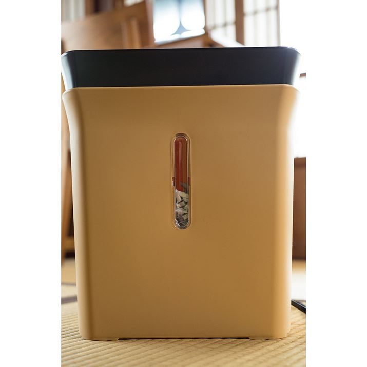 届いた「P5GC」は、これまで見たことのないベージュカラー。シュレッダーといえば、白か黒というイメージだったので、まずそのイメチェンぶりに驚きました。サイズは本体とダストボックスをセットした状態で、32.1(幅)×16.9(奥行き)×35(高さ)cm。家庭用としては若干大きめの印象を受けましたが、わが家でシュレッダーを使う時といえば、思い立って部屋を大掃除する時だったりするので、大量の紙を一気に裁断できるという点では、手頃なサイズかも、と思いました。ダストボックスの容量は8.9L。これは、A4コピーサイズ80枚分の量に相当するそうです。