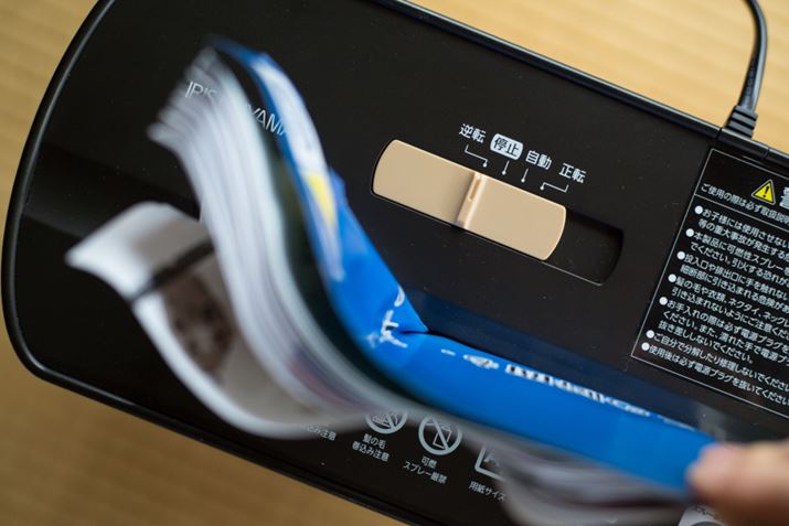 でも、刃の鋭さにひるんではいられません。というわけで、裁断してみましょう。やり方は簡単。まず、操作ボタンを「停止」から「自動」に切り替えます。そして、本体の中央にある紙投入口に紙を入れるだけ。紙がセットされると、自動的に中のカッターが回転し、紙を裁断する仕組みになっています。