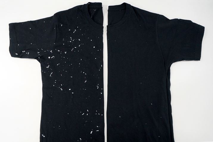 近年の縦型に装備されることが多い固定式の糸くずフィルター搭載機と「ツインウォッシュ」で、ティッシュと一緒に洗濯したTシャツの仕上がりを比較してみた。右側が、「ツインウォッシュ」のスイング式糸くずフィルターの効果。若干の付着はあるものの、少し払えばそのまま着られそうだ