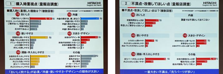 高級炊飯器購入者に実施したアンケートによると、選ぶ際は第一においしさが求めてられている。しかし実際に使ってみると、味への不満よりも後片付けに手間を感じている人が多いことがわかった