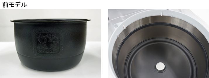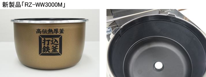 この要となる炊飯方法はそのままに、「RZ-WW3000M」では内釜を変更した。基本的に高級モデルになるほど内釜が厚くなる傾向があるが、その理由は蓄熱性を高めるため。その考えを一変し、内釜は“伝熱性の重視”のアルミ合金に切り替え、蓄熱は内釜を囲む本体で行う仕様とした。