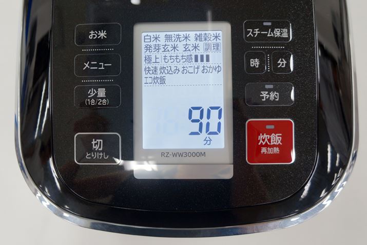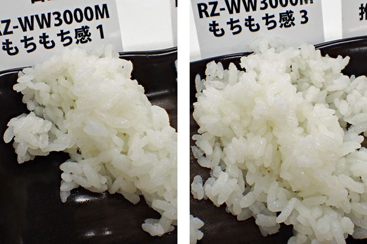 圧力とスチームで炊く炊飯方法は、もちもちとしたごはんになる特性がある。しかし、食感や味わいなどは個々で好みが異なるもの。そこで「RZ-WW3000M」は、もちもち感を3段階から選べるようにした。ちなみに“もちもち感”とはごはんを最初噛んだ時の食感ではなく、何度か咀嚼した際の弾力のことを指している。