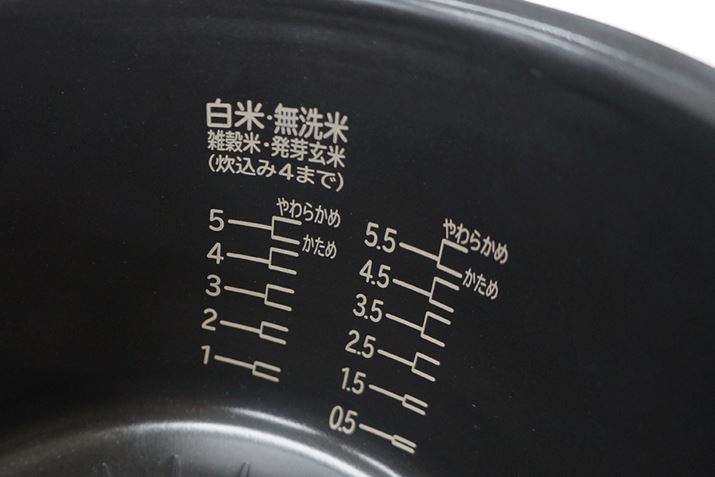 【硬さは水加減で調整】センター線の上下に「やわらかめ」「かため」の目盛りを併記。この範囲内であれば、どんな古米でもおかゆのようにベチャベチャになったり、硬くて食べられないというような状態にならずに炊ける