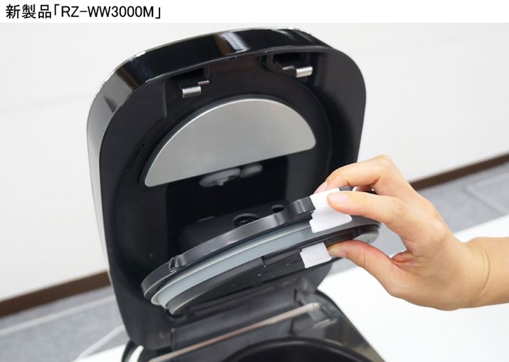 従来は本体天面に設置されていた蒸気を受けるカートリッジを、「RZ-WW3000M」では内フタと一体化。内フタを取れば同時に外れる仕様となっているため、取り外しの手間が減った