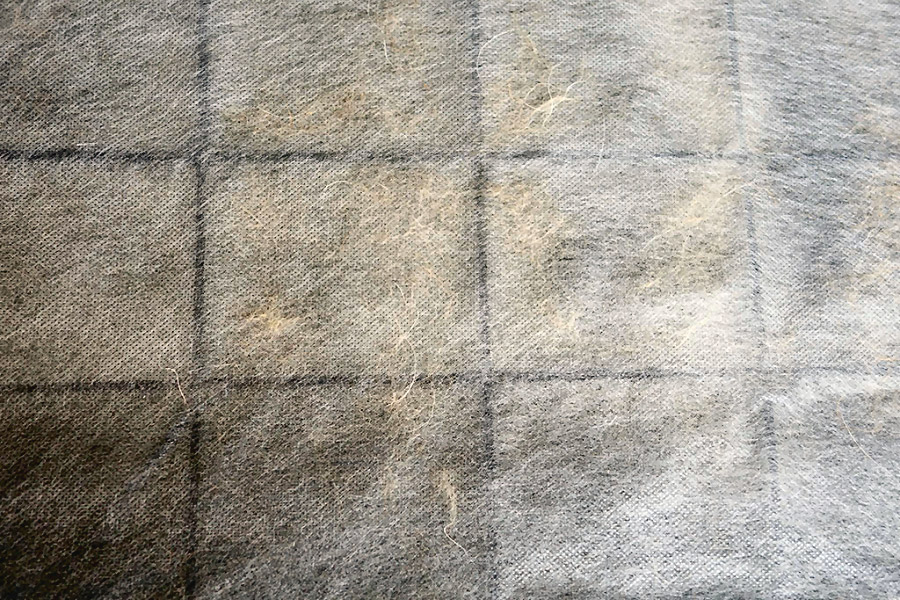 使い捨てフィルターは、1か月でゴッソリと犬の毛まみれに。こちらはクシャクシャと丸めて捨てるだけなので、メンテナンスも簡単