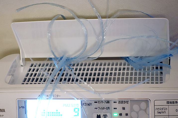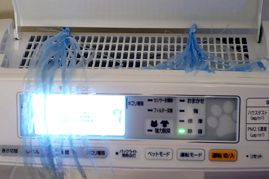 強で動作すると、かなりうるさい駆動音です。そのかわり、風量を調べるために置いた紐が天井まで吹っ飛ぶほどの風量。天井まで強く風感じられるほど強力に空気を清浄します