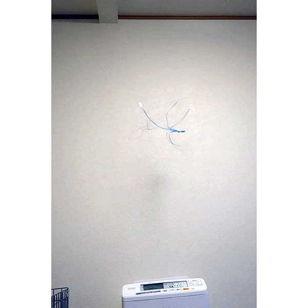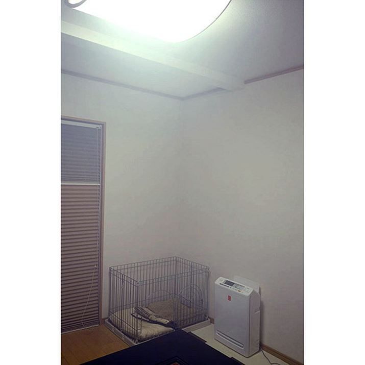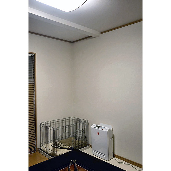 我が家はリビングの続き部屋にある、犬のケージ横にPMMS-AC100-Pを設置。横は20cm、上部60cm以上のスペースが必要ですが、製品裏は壁にくっつけても大丈夫