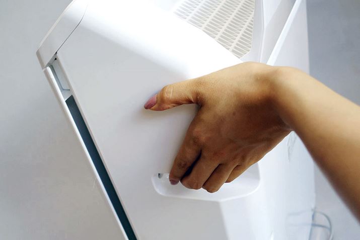 操作ボタンは製品上部に集約。また、大き目の液晶画面では部屋の空気の汚れ具合がわかる「PM2.5」「ハウスダスト」濃度を表示できる