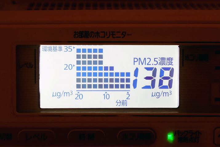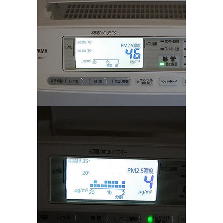 液晶画面で部屋の汚れの推移まで確認できるのが非常に面白い。また、モニターはバックライトで明るく表示することも可能。PMMS-AC100-P導入時は46だったPM2.5の数値が、翌日には4までキレイに!