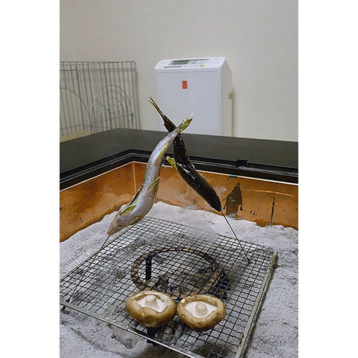 PMMS-AC100-Pの前で、脂の多い鮎を焼いてみました。鮎の下の炭から煙が上がり始めているのがわかりますか?