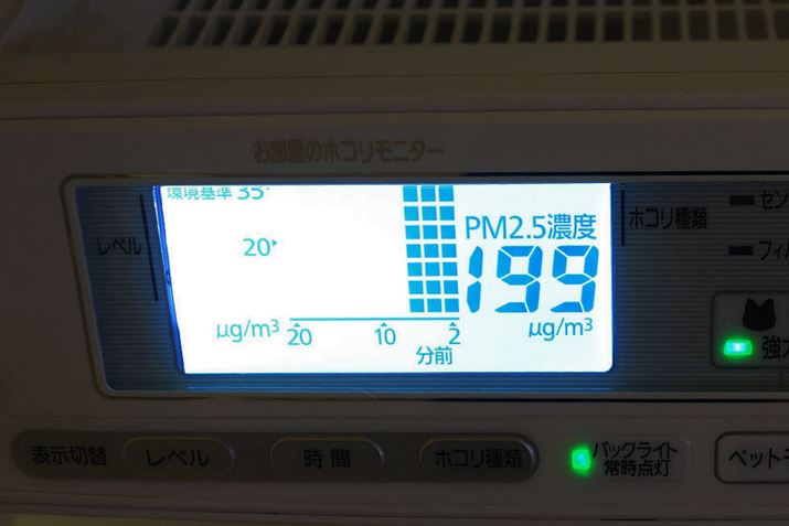 ところが、魚を焼いて部屋のなかが白っぽくなるまで煙まみれにした後、PMMS-AC100-Pをペットモードで作動させたところ、10分でほとんどの煙が一掃されていました。さらに、炭火焼きをした次の日も、ほとんど煙のニオイがしません。ちなみに、煙で室内が白っぽくなった時点では、PM2.5モニターの数値は最大値である「199」でしたが、ペットモードを10分使用したあとは「75」、そして翌日朝には「2」という数字になっていました。この数字には、毎回、炭火焼きの惨状を知る家族もビックリです。