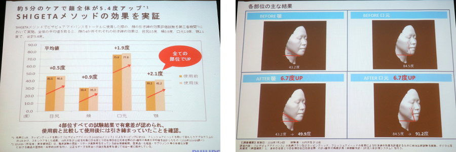 「SHIGRTAメソッド」を実施した結果、目尻、ほお、口元、あご4部位が全体で5.4°も上がったそうです。