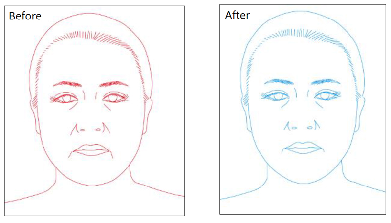 こちらは、全体の平均値、目尻0.5°、ほお0.9°、口元1.9°、あご2.1°の変化をイラストでシミュレーションした例。Before に比べ、Afterはほおのハリ感がアップしたため、シワも目立たなくなりました。パーツが引き締まることによって、表情まで生き生きとしているように見えます