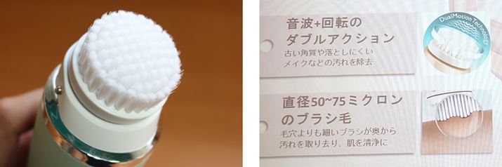 直径50〜70ミクロンのブラシ毛を約17,200本使用(ノーマル肌用ブラシ)し、しっかりとした洗浄力でもやわらかい肌当たりを実現。筆者は普段「敏感肌用ブラシ」を愛用しており、洗い上がりは「ひと皮むけた」ような爽快感で化粧水がぐんぐん浸透していく気がします。製品に付属しているのは「ノーマル肌用ブラシ」ですが、別売で「敏感肌用」や「角質ケア用」のブラシも用意されているので、肌質やケアの内容に合わせて使い分けができるのもうれしい