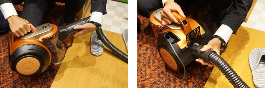 ホースを装着した様子。「TC-ZXE30P」のように、吸い込み口からサイクロンボックスにダイレクトに空気やゴミが入る構造に改良しても、それをきちんと分離するのは容易なことではないのだそう。そのため、サイクロンボックス下部に吸い込み口を設けている掃除機が多いのだとか
