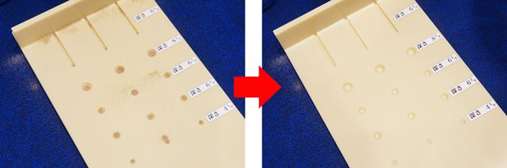 深さが8mm、6mm、4mmと異なる溝のある板に砂状のゴミを撒いて、清掃力を検証してみた。