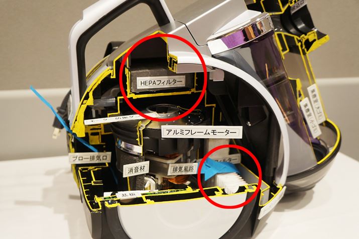 サイクロンボックスの遠心分離で99.9%のゴミを捕集した後の空気は、HEPAフィルターとULPAフィルターを通過(赤い囲み部分)。0.3μmの微細なハウスダストも逃さないので、最終的な捕集率は99.999%となった