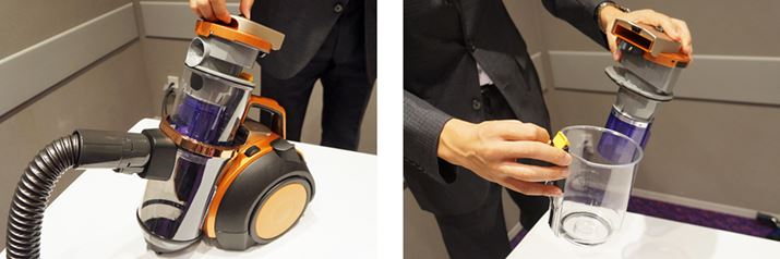 サイクロン式掃除機は掃除したゴミが見えるからこまめに廃棄できると言われているが、サイクロンボックスが完全に透明でないことも多い。また、使用していると汚れで半透明のような状態になり、溜まったゴミが見えづらくなる。そこで「TC-ZXE30P」は、サイクロンボックスを照らすLEDランプを搭載。ゴミが蓄積されるとLEDランプが見えなくなっていくので、廃棄タイミングを知る目安にできる。