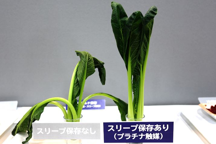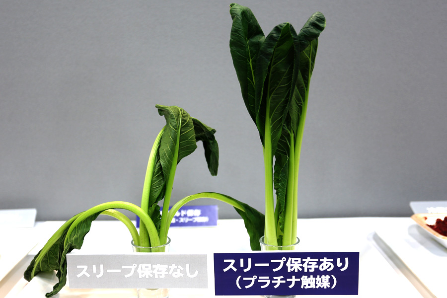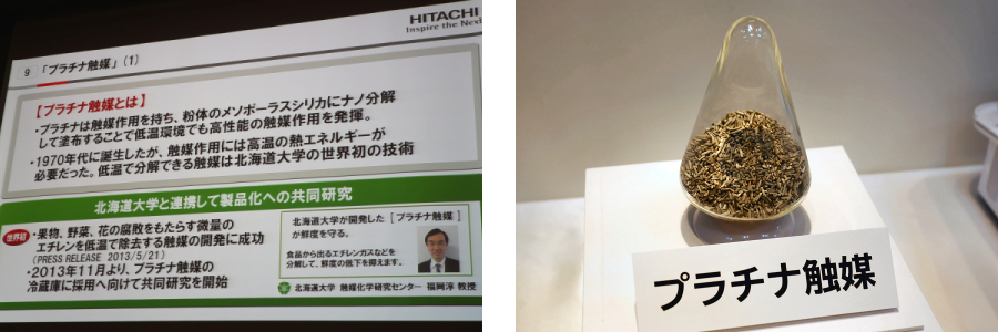 プラチナ触媒は、野菜の成熟を促進するエチレンガスやニオイ成分が接触するとそれを分解し、野菜の呼吸活動を抑制する炭酸ガスを発生する。プラチナ触媒の採用は、同社と北海道大学触媒化学研究センターとの共同研究によって実現した。写真右は、プラチナ触媒の原料となるもの