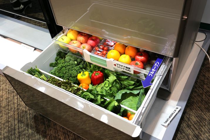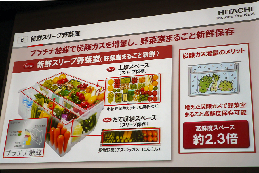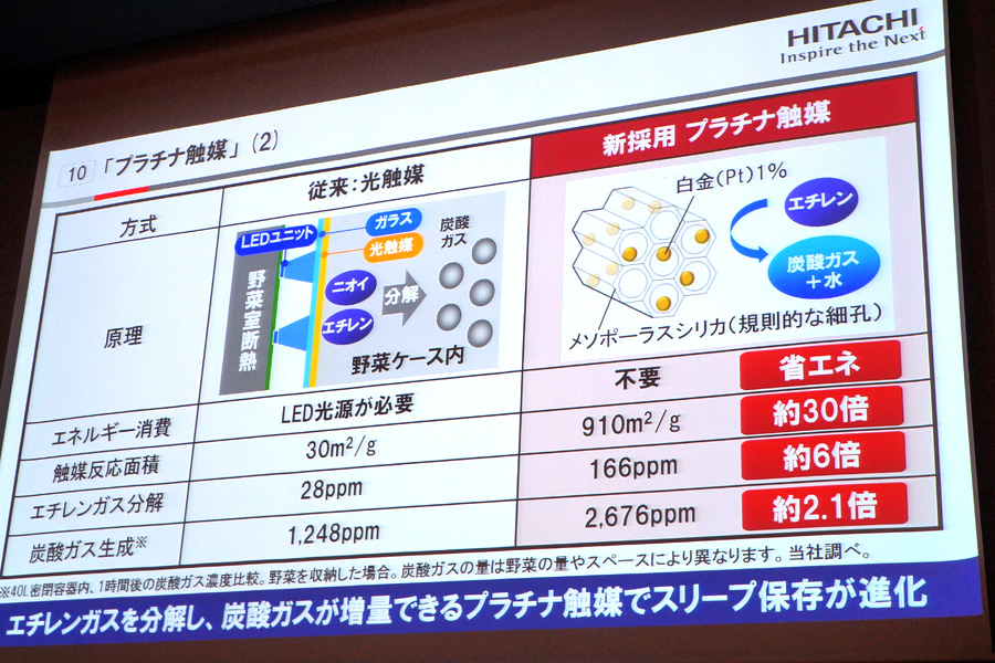 プラチナ触媒の効果として、最初に野菜室「新鮮スリープ野菜室」をチェック。これまでの光触媒を使った野菜室の「スリープ保存」は、炭酸ガスの発生量の問題やエチレンガスの分解にLED光源が必要であることなどから、野菜室の下段スペースでしか「スリープ保存」ができなかった。しかし、プラチナ触媒を採用した新モデルでは、これらの問題をクリア。野菜室のすべてがスリープ保存に対応する「新鮮スリープ野菜室」へと進化した。