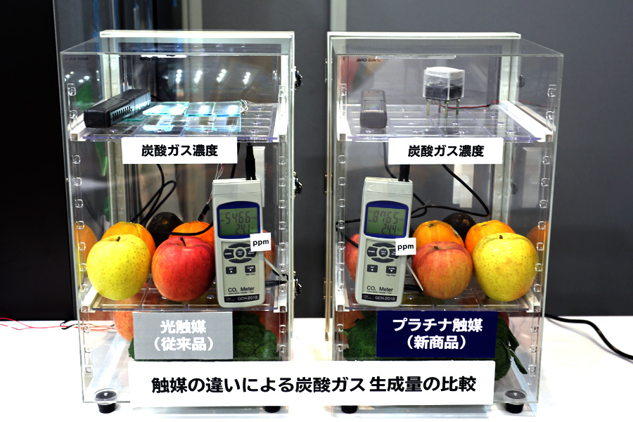 光触媒とプラチナ触媒の炭酸ガス発生量の違いを確認するためのデモンストレーション展示。撮影した時点では、光触媒のケース内の測定器は5466ppm。これに対し、プラチナ触媒が入ったケース内は8765ppmを示していた
