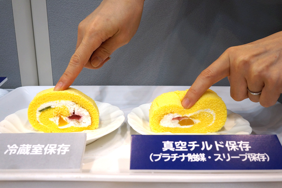 真空チルド保存の性能実験結果。一般的な冷蔵室で保存したものと比較展示。見た目の色や形状が異なっているのがわかる。ロールケーキは、一般的な冷蔵庫で保存したほうは乾燥し硬くなってしまい、指で押してもへこまないほどだったが、真空チルド保存のケーキは、まだふわふわ感をキープしていた