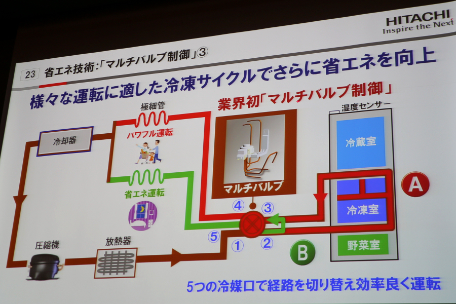 省エネ機能面では、業界初(2015年7月 同社調べ)の「マルチバルブ制御」を搭載。パワフル運転と省エネ運転など、異なる状況でも2つの冷凍サイクルを自動で制御する機能に、1つのバルブで5つの冷凍サイクルが切り替えられるというこの「マルチバルブ制御」機能が新搭載されたことで、より高い省エネ効果が得られるようになったという。