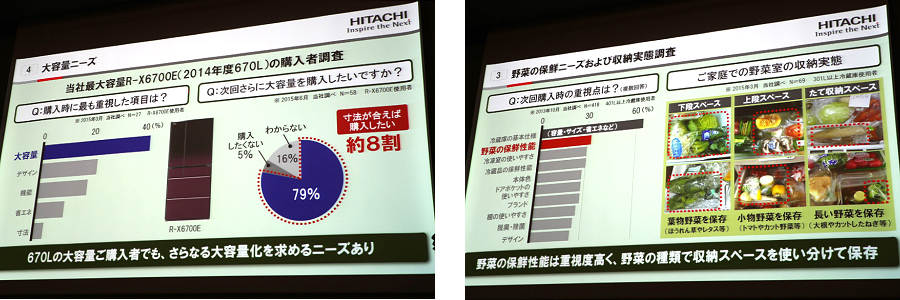 670Lモデルの購入者の約8割が「さらに大容量を購入したい」と回答したという。また、野菜室は種類ごとに分けて収納していることもわかったという