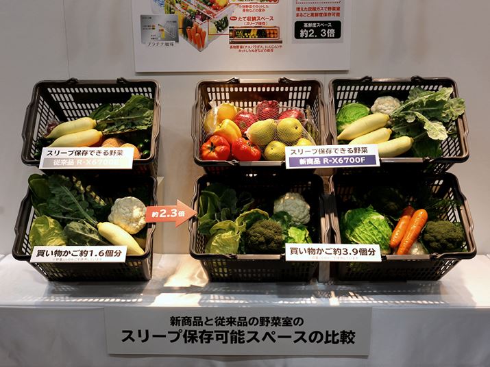 従来モデルに比べスリープ保存に対応するスペースが約2.3倍になった野菜室には、“買い物かご約3.9個分”の野菜が収納できるという