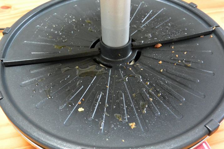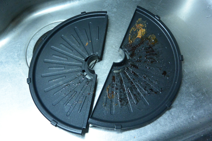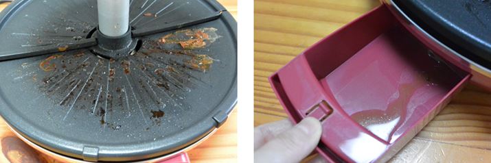 さらに2巡ほど食材を焼き、焼肉終了。プレートに食材がくっついてしまうことはなかったが、油汚れはたっぷり。また、油受けにも余分な油が溜まっていた