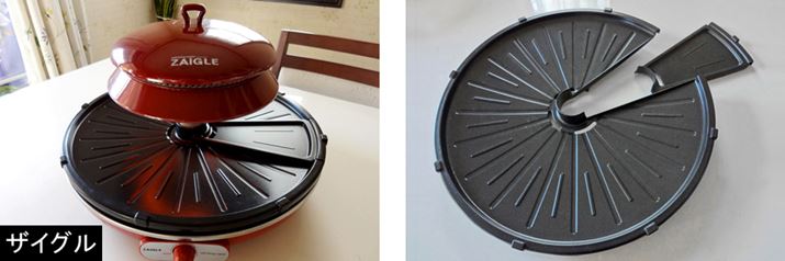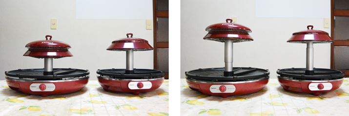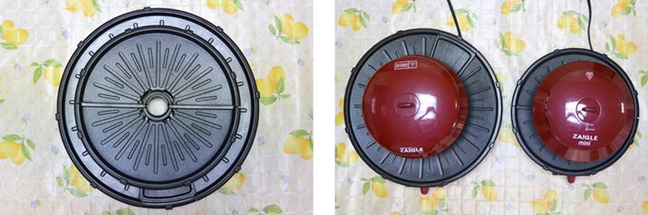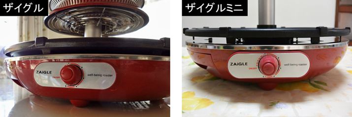 「ザイグル」(左)のサイズは直径400×高さ270〜345mmで、「ザイグルミニ」(右)が直径320×高さ278/321mm。プレートの上にあるフード(熱源となるヒーター搭載)は位置が変えられるようになっているが、「ザイグル」が9段階調整なのに対し、「ザイグルミニ」は2段階のみ