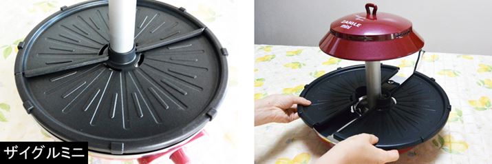 「ザイグル」シリーズ全般に共通しているのは、円形のプレートとその上に熱源(カーボンヒーター)のある構造。ヒーターから放射された赤外線が食材を炙るとともに、プレートを加熱し、その熱で食材の裏面が焼かれる。プレートの下に熱源のある一般的なホットプレートのようにプレートが高温にならないため、煙が出にくいという。この基本の仕様はそのままに、小型化したのが「ザイグルミニ」だ。