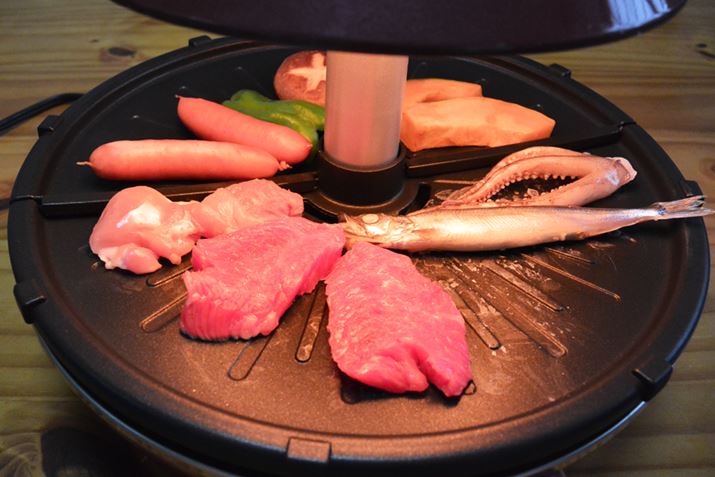 牛肉と鶏肉を各2切れ、ししゃも1匹、ゲソ足/ピーマン(半分)/しいたけを1個ずつ、ウインナー/かぼちゃを2個ずつを並べると、プレートはほぼいっぱいに。「ザイグル」で試した時の食材は若干異なるが、「ザイグルミニ」の倍は並べられる。「ザイグルミニ」は、「ザイグル」の半分ぐらいが一度に調理できると考えていいだろう