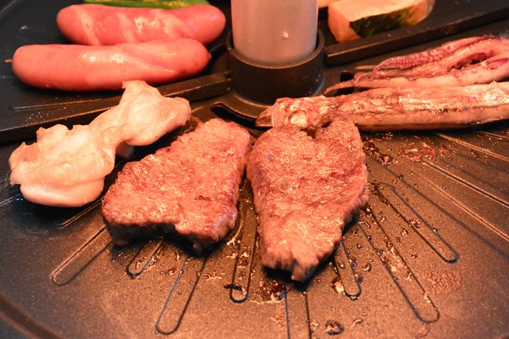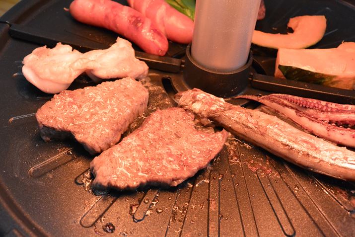 卓上調理の代表格ともいえる焼肉を、「ザイグルミニ」でやってみよう。フードは下段で、火力は「5」でスタート。プレートに油は塗らなくてよい。通常サイズの「ザイグル」でも焼肉をしたことがあるのだが、焼け具合や使い勝手に差は出るのだろうか。
