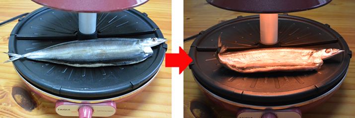 プレートから尾と頭が少しはみ出してしまったので、その部分は生焼けになると思ったのだが、熱により魚が湾曲。きちんと熱される範囲内に納まった。焼き魚で困る“煙がモクモク”にもならず、魚の焼けるいい香りだけが漂う