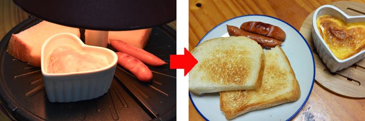 食パンは途中でひっくり返さないといけないが約2分で焼きあがるので、完成までに時間がかかる耐熱容器に入れた玉子から調理スタート。その後、様子を見ながらウインナーを置き、最後に食パンをセットする。このように、異なる食材(量)の調理には時間差を使うワザが必要となるが、うまくできればセット調理が可能だ。「ザイグルミニ」の前に座って、番をしているだけで1皿作りたい筆者にはもってこいの調理だった