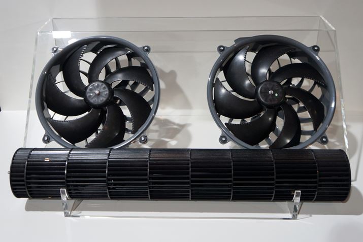 扇風機のような形をしたプロペラファンが、「霧ヶ峰 FZシリーズ」には搭載されている(上)。その下の円筒型のものは、一般的なエアコンのファンだ