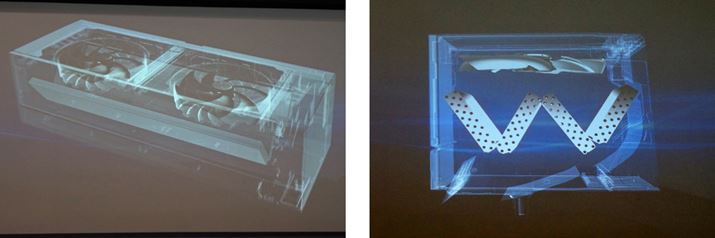 写真左の部屋の様子を、多方向から写したのが写真右。床面には温度を感知するセンサーが装備されており、写真右の左側(黄色いゾーン)に温度変化が表示される。写真右の右上はプロペラファンの動き、右下は部屋の様子