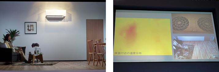 「霧ヶ峰 FZシリーズ」のリアルな実力を、会場内のステージで見せてくれた。女性がソファでくつろいでいる部屋に、男性が帰宅してくる設定だ。季節は冬、暖房運転で検証をスタート。