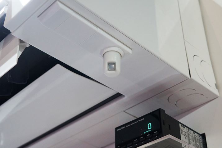 360°回転してセンシングする「ムーブアイ極」。背面もカバーできるので、エアコンの設置されている壁側もきちんと温度調整できるのが特徴だ。「霧ヶ峰 FZシリーズ」に搭載される「ムーブアイ極」は、身体の末端部分(手先や足先)の体温を見張れるようになったため、個人の体感まで判断できるという