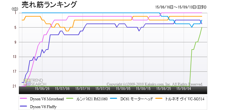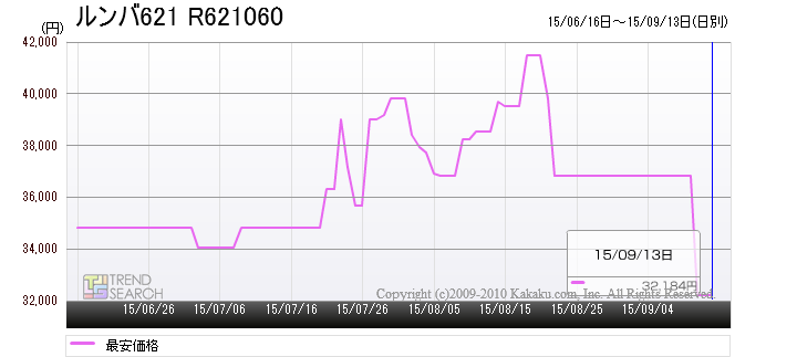 「価格.comトレンドサーチ」で見ると、「掃除機」カテゴリーにおける売れ筋ランキングでは、本製品「ルンバ621」は、2014年9月12日の発売後、2015年9月7日まで30位以下の順位で推移。「ルンバ」シリーズの中では、比較的人気の低いモデルだったが、9月11日に最安価格が32,184円まで下がると、順位が7位まで急上昇。9月13日に5位、翌日の14日には2位まで順位を上げた。なお、本製品の9月13日現在の最安価格は32,184円で、発売時の42,405円より24.1%安くなっている。