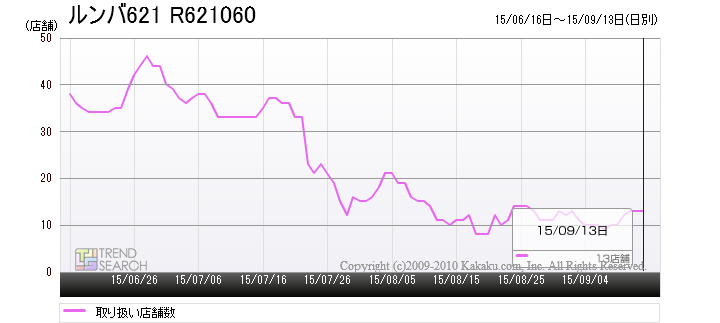 上の図は、本製品の取扱店舗数の推移を示したものだが、これを見ると、9月13日の取扱店舗数は13店舗まで減少している。発売から約1年を経たこともあり、そろそろ在庫処分の段階と見ることもできそうだ。「ルンバ」シリーズではエントリーモデルにあたる本モデルだが、基本性能は上位モデルと変わらないだけに、現在の価格水準はかなり値ごろ感が強いと言える。