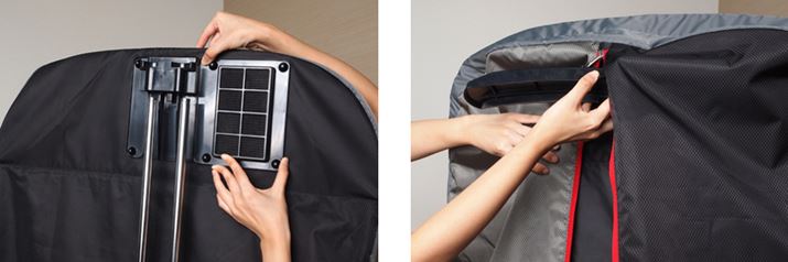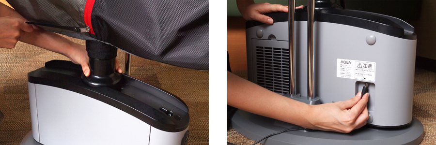 衣類袋の裏側にある差込口をポールにはめ込み固定したら、衣類袋の内側上部に先ほど外した本体カバーを取り付けて衣類袋の形を安定させる。衣類袋下部のダクトをダクト差込み口に取り付けて、電源アダプタをコンセントと本体に接続