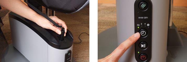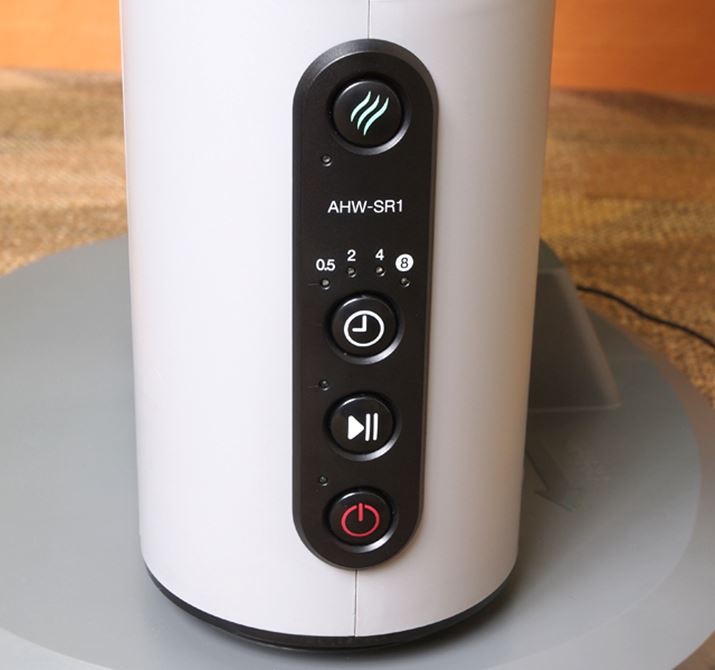 操作部は本体の側面に配置。電源を入れたら、時計マークの「タイマーボタン」でモードの選択を行い、その下の「スタート/一時停止ボタン」を押して運転を開始する。一番上にあるのは「フレグランスモード」のボタン。8時間モードを使用した場合でも、電気代は約1.9円/回と、コストがあまりかからない