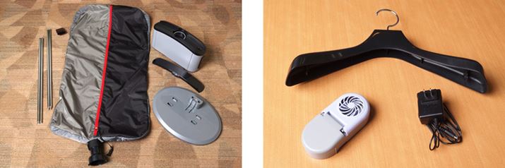 本体と衣類袋のほか、ハンガー台ベースとそれを組み立てるためのポールなどのパーツが同梱されている(写真左)。ハンガーや「フレグランスモード」に使用する香りケースも付属(写真右)。ハンガーは、自宅にあるものを使用してもOKだ