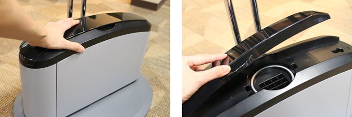 ハンガー台ベースに本体を設置し、本体カバーを外しておく(カバーは後ほど使用)。本体上部中央の丸い穴(ダクト差込み口)からオゾンを含んだ空気が放出される。ハンガー台ベースには本体を固定するツメが付いているので、使用中に倒れる心配はない