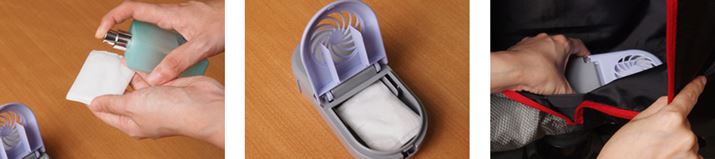 香水を3プッシュ(0.15ml)ほど吹き付けたコットンを入れたフレグランスケースを、衣類袋の下のダクトの突起にセットする。アロマオイルなど、香水以外のものの使用は不可