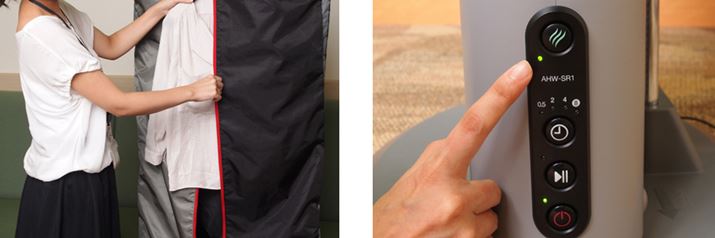 ハンガーにかけた衣類を衣類袋にセットしたらファスナーを下げて、ファスナー持ち手に付いている「オゾン漏れ防止キー」を本体の「キー差込口」に差し込んで固定する。その後、「タイマーボタン」でモードを選択し、「スタートボタン」を押せば運転が開始される