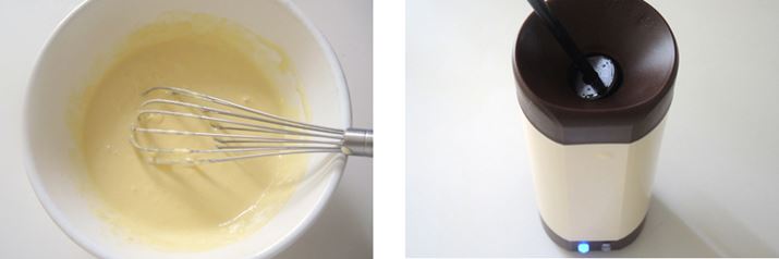 (1)まずは生地の準備です。卵と牛乳を合わせてホットケーキミックスに加えて混ぜ、3等分にしておきます。