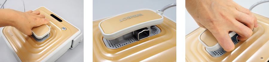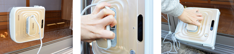 電源をONにして、下にある窓枠から10cm以上離した位置に「WINBOT W710」を当てると吸着します。後は、スタートボタンを押せばOK。